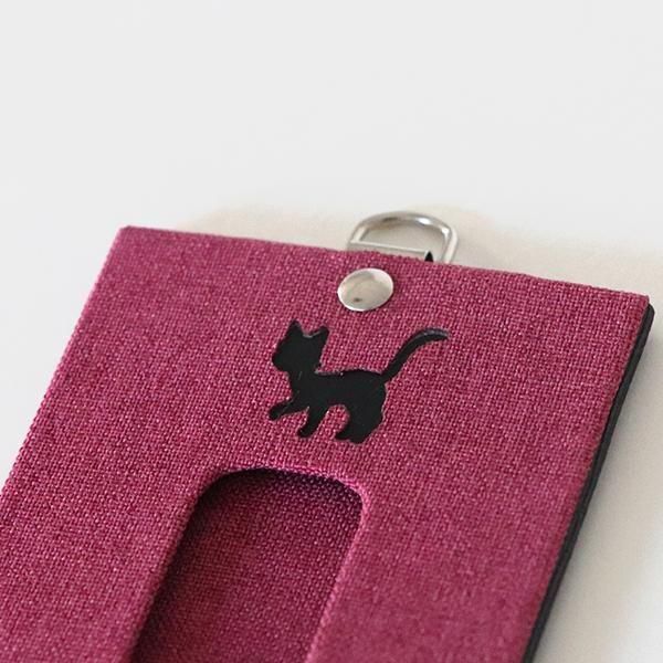 表には、地紋の入った黒の博多織生地。裏面にはローズ色の生地に、黒猫のシルエットをあしらい、下部には「WITCH WATCH」のロゴを木への焼き印で添えました。